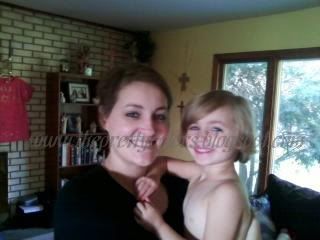 The Girl gave herself a half mullet on the left side of her head, so I had to even it out. She looks so cute!! This picture was taken with my husband's cell phone, so it doesn't really capture that much, but you get the idea. Mine is super short, as we know. :) But, I'm loving it more and more.